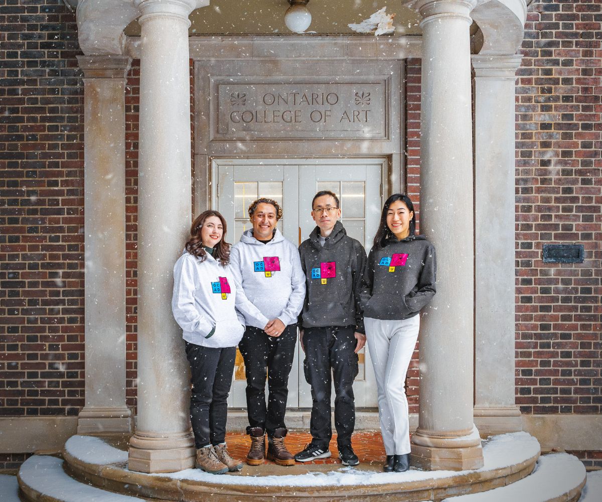 (L to R): Julia Rose Sutherland (Assistant Professor, Indigenous Visual Culture and Material Art and Design), Dr. Andrew Gayed (Assistant Professor, Art History and Visual Culture), Angus Mok (Assistant Professor, Teaching Stream), Marie-Hélène He (Lecturer, Liberal Studies).